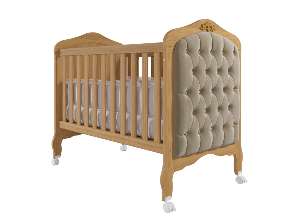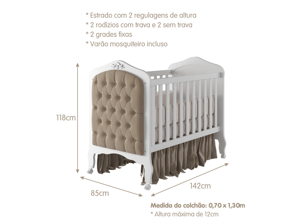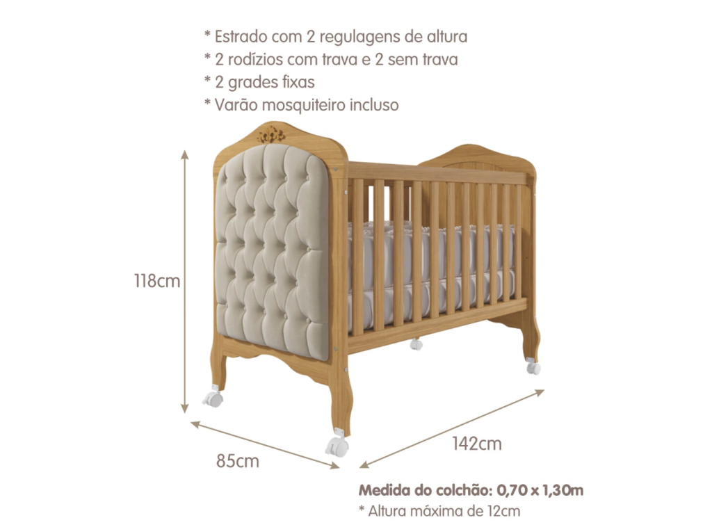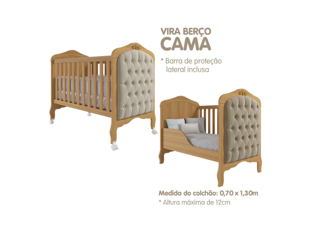 Este HARMONIA é um produto que vai levar mais elegância e sofisticação para o quarto do seu bebê.Produzido com MDF, madeira resistente que garante estabilidade e segurança, ele é a melhor opção para deixar que seu anjinho descanse.O melhor de tudo é que ele acompanha o crescimento do seu filhote porque também vira um Berço Cama.O detalhe do Capitonê é uma maravilha a parte, você e quem mais dividir o ambiente do seu Bebê ficarão deslumbrados.Acompanha 04 rodizios e varal mosquiteiro e o kit capitone;Registro certificado Inemtro 006885-2018 Colchão indicado LARG 70cm X COMP 130xm X ALT máxima 12cm; Colchão não acompanha; Medidas do móvel montado ALT 118cm X COMP 135cm X PROF 85cm ;