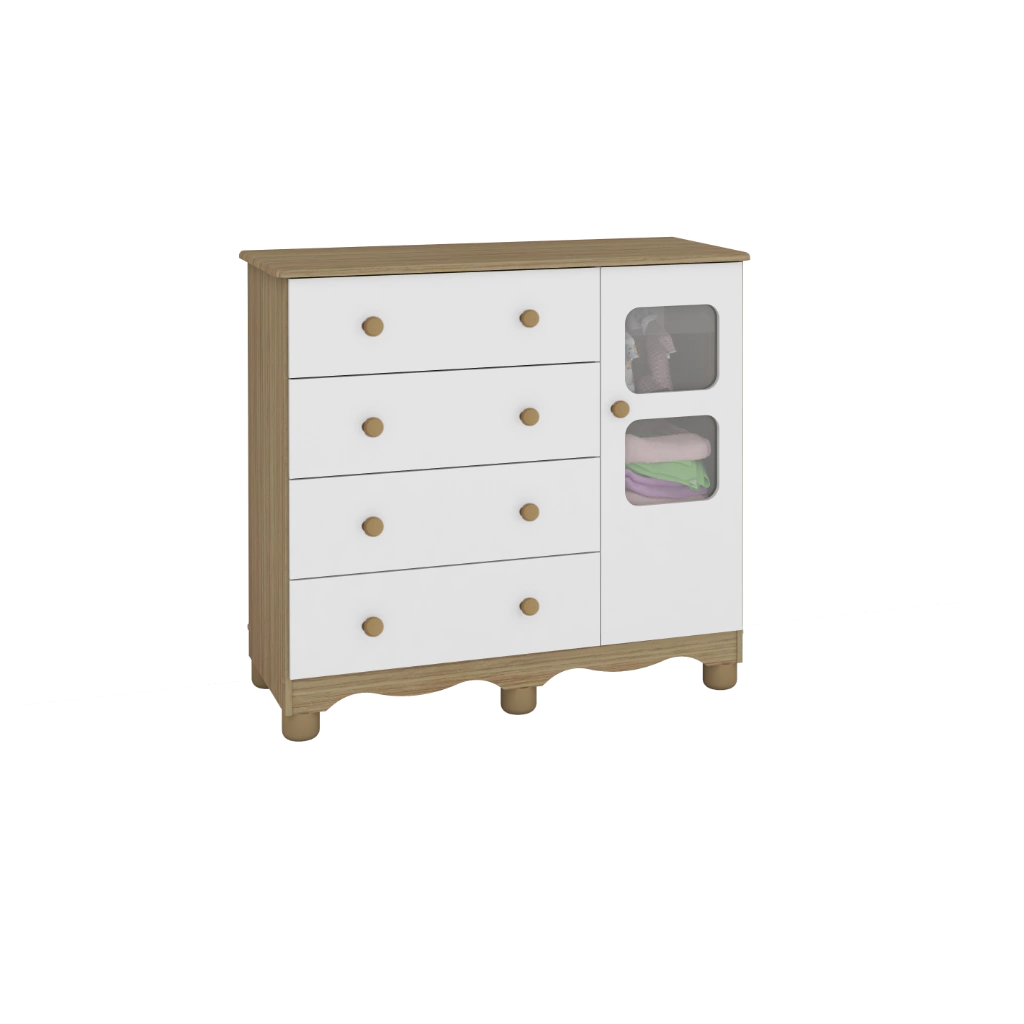 04 gavetas com corrediças metálicas e 01 porta com mini cabideiro.