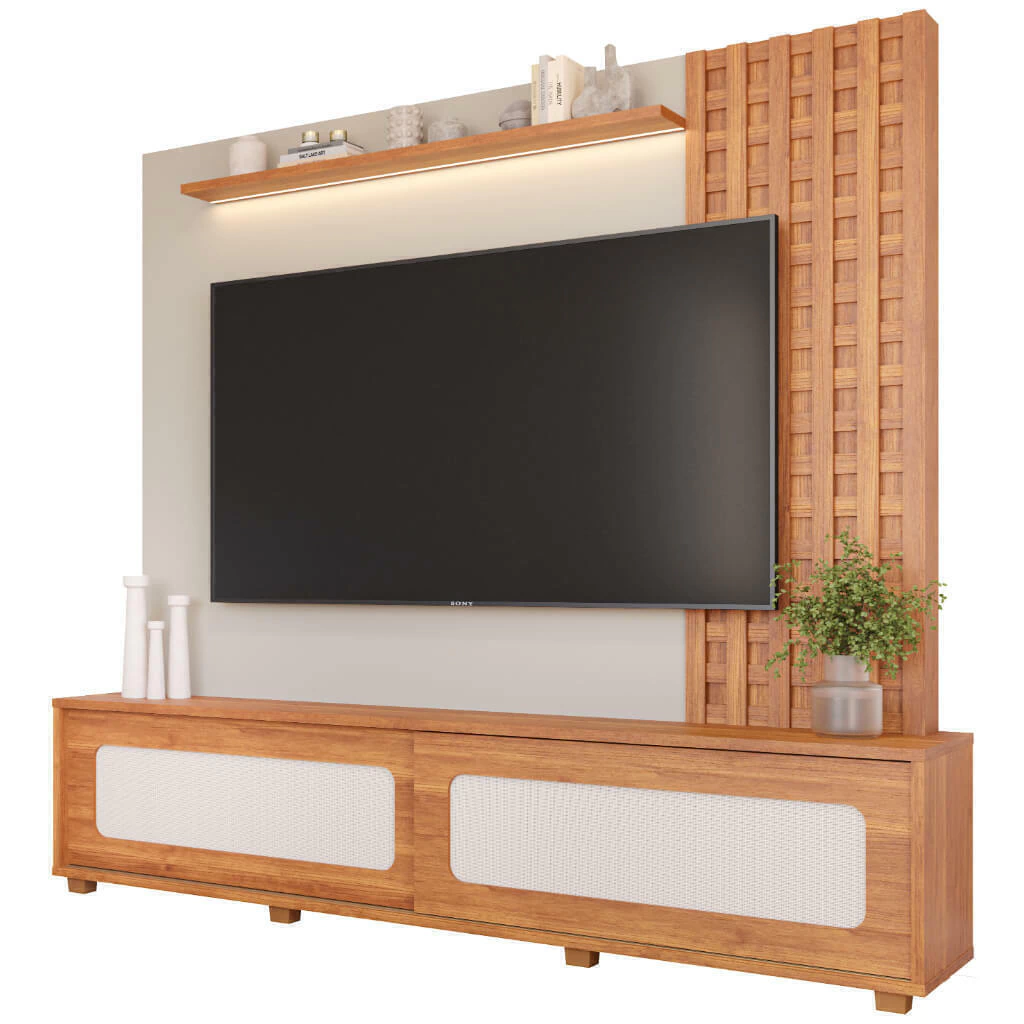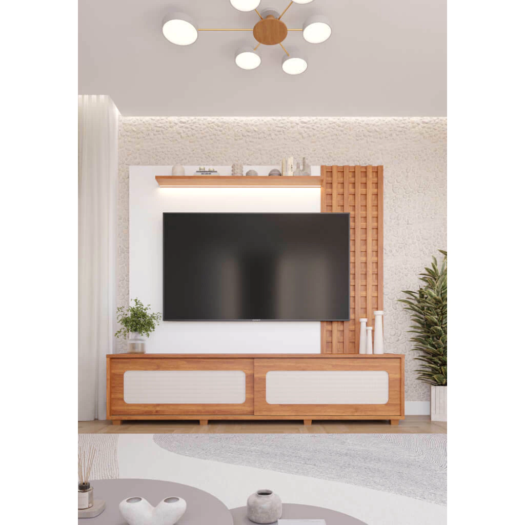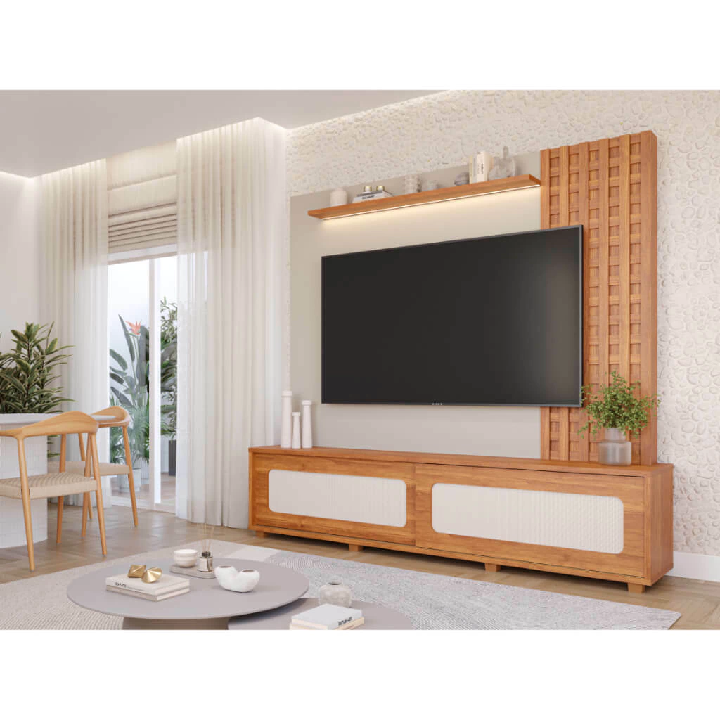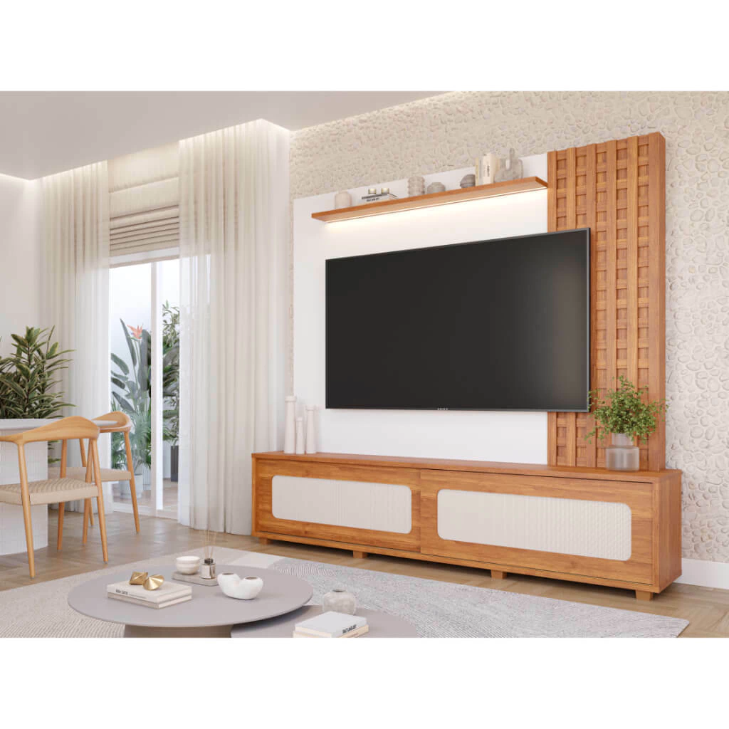 Fabricado em MDF com detalhes em telado e ripado trançado. Transforme a sua sala em um ambiente aconchegante com essa linda estante.