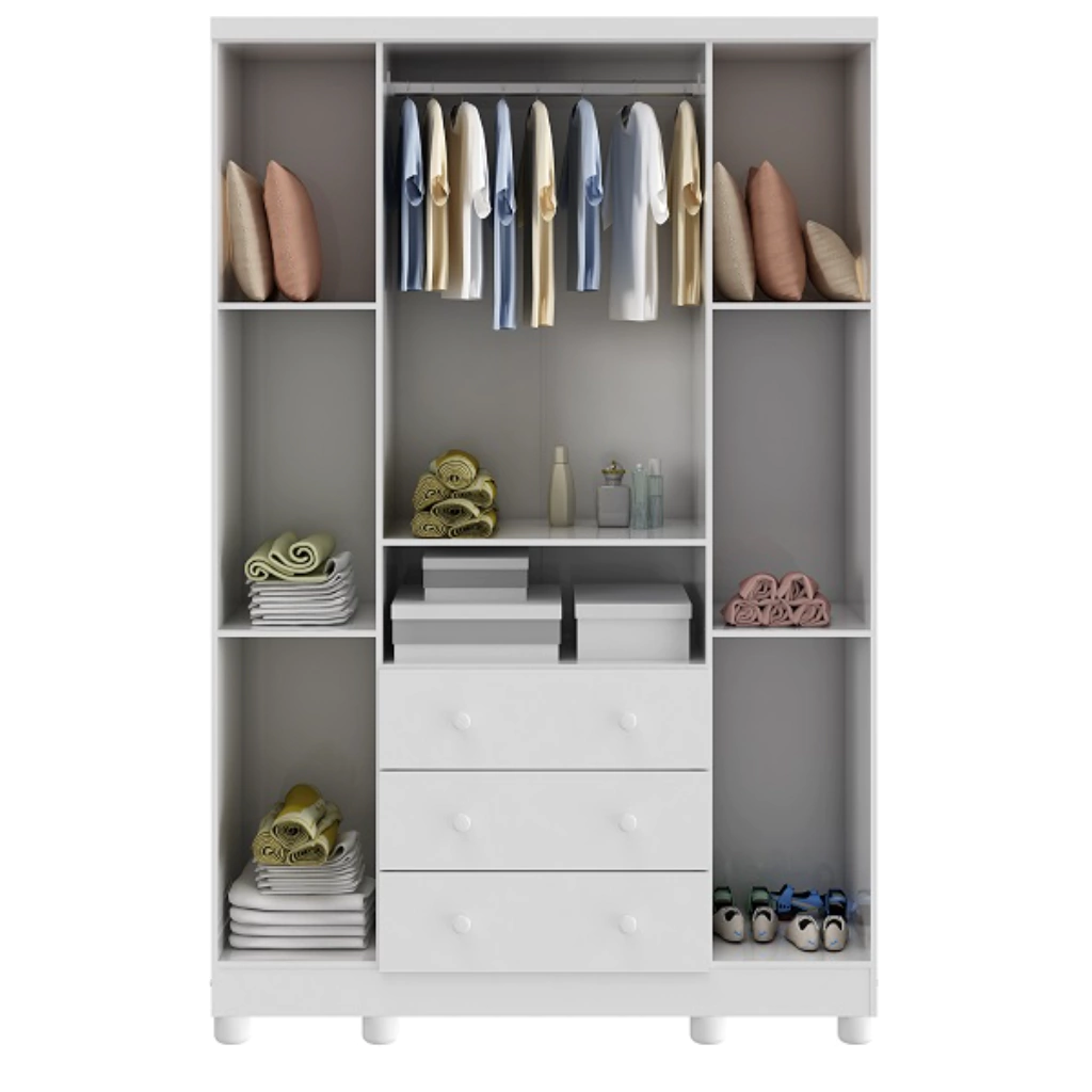 O Armário Uli 04 portas é um produto 100% MDF, sua pintura é atoxica, possui cabideiro metálico, puxadores plásticos, corrediças metálicas, pé plástico, 02 modelos de rodapé incluso e portas com PETG cristal.