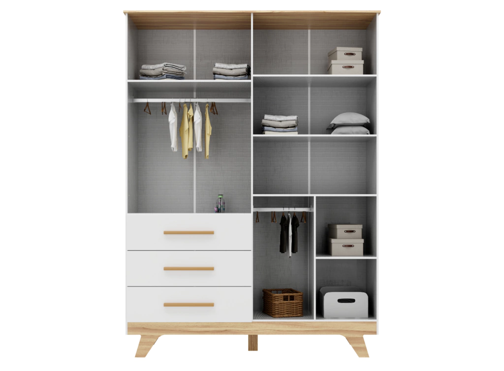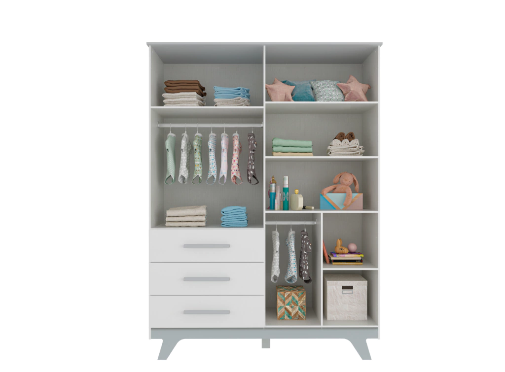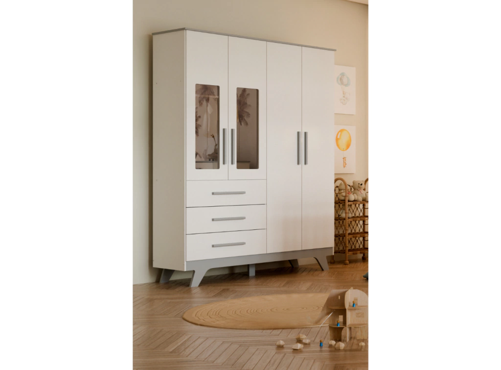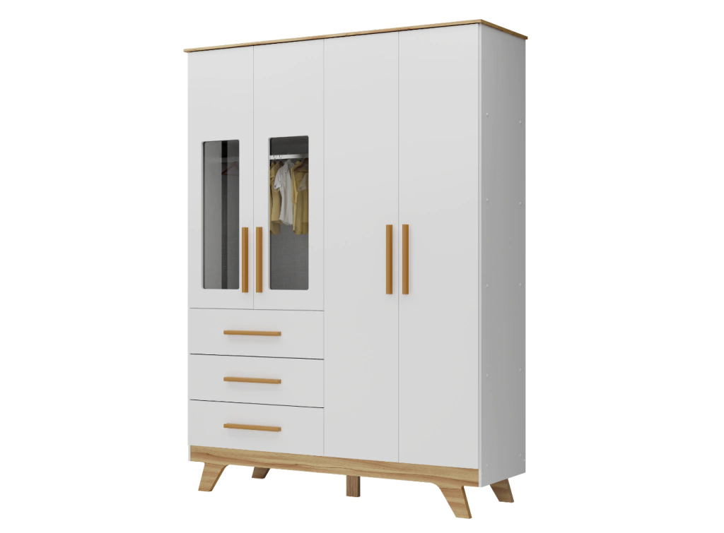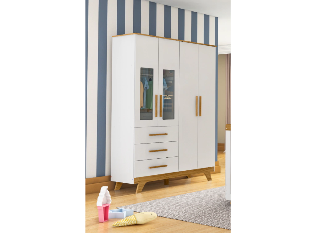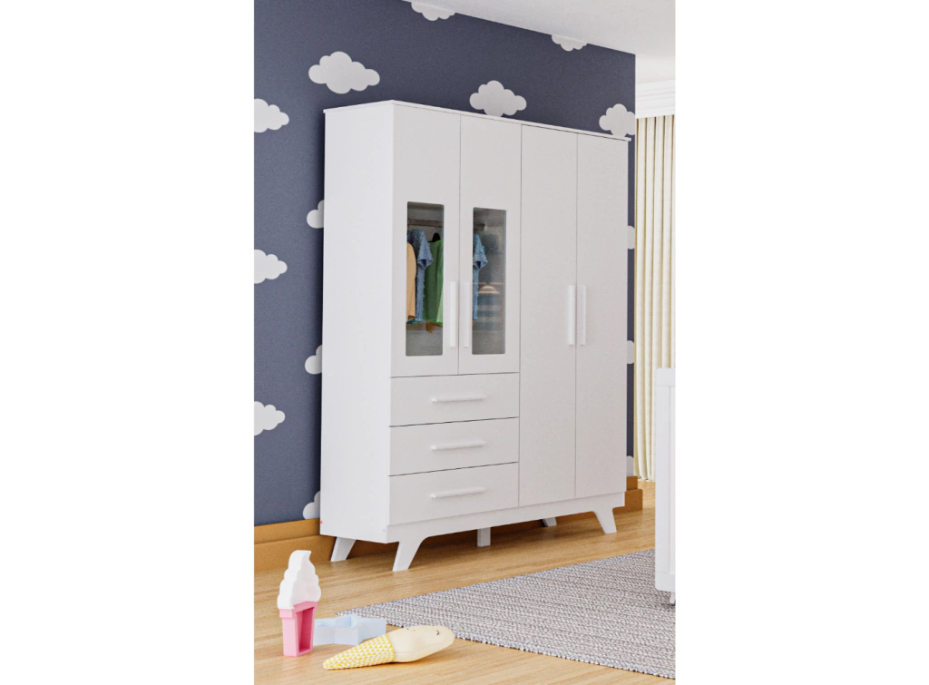 O Armário Retrô 4 Portas é um produto 100% MDF e possui pintura atóxica. Seu caixote é em chapa de 12 mm, enquanto as frentes são em chapa de 15 mm. Seus pés são usinados em uma peça única de MDF 25 mm. Os puxadores são fabricados em MDF revestido com papel melamínico. Possui cabideiro metálico, gavetas com corrediças telescópicas e portas