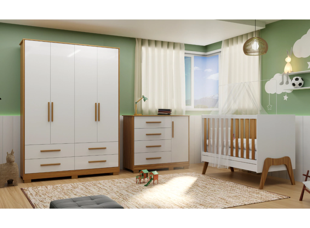 01 Guarda Roupa 04 portas Fabricado em MDF; Corrediças telescópicas; cabideiro aluminio; puxadores em MDF revestido; acabamento interno texturado linho; ótimo espaço interno;