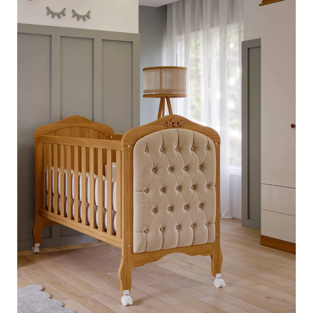 Este HARMONIA é um produto que vai levar mais elegância e sofisticação para o quarto do seu bebê.Produzido com MDF, madeira resistente que garante estabilidade e segurança, ele é a melhor opção para deixar que seu anjinho descanse.O melhor de tudo é que ele acompanha o crescimento do seu filhote porque também vira um Berço Cama.O detalhe do Capitonê é uma maravilha a parte, você e quem mais dividir o ambiente do seu Bebê ficarão deslumbrados.Acompanha 04 rodizios e varal mosquiteiro e o kit capitone;Registro certificado Inemtro 006885-2018 Colchão indicado LARG 70cm X COMP 130xm X ALT máxima 12cm; Colchão não acompanha; Medidas do móvel montado ALT 118cm X COMP 135cm X PROF 85cm ;