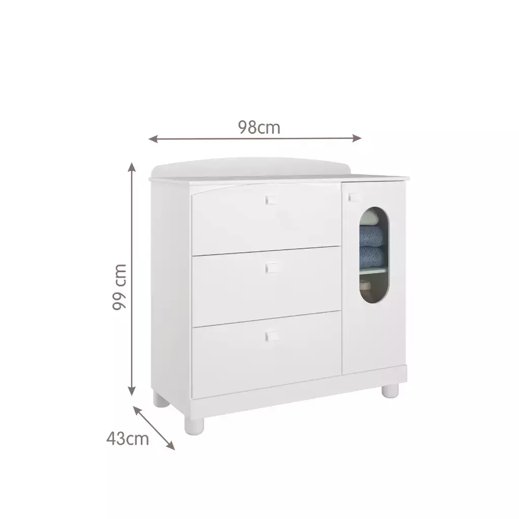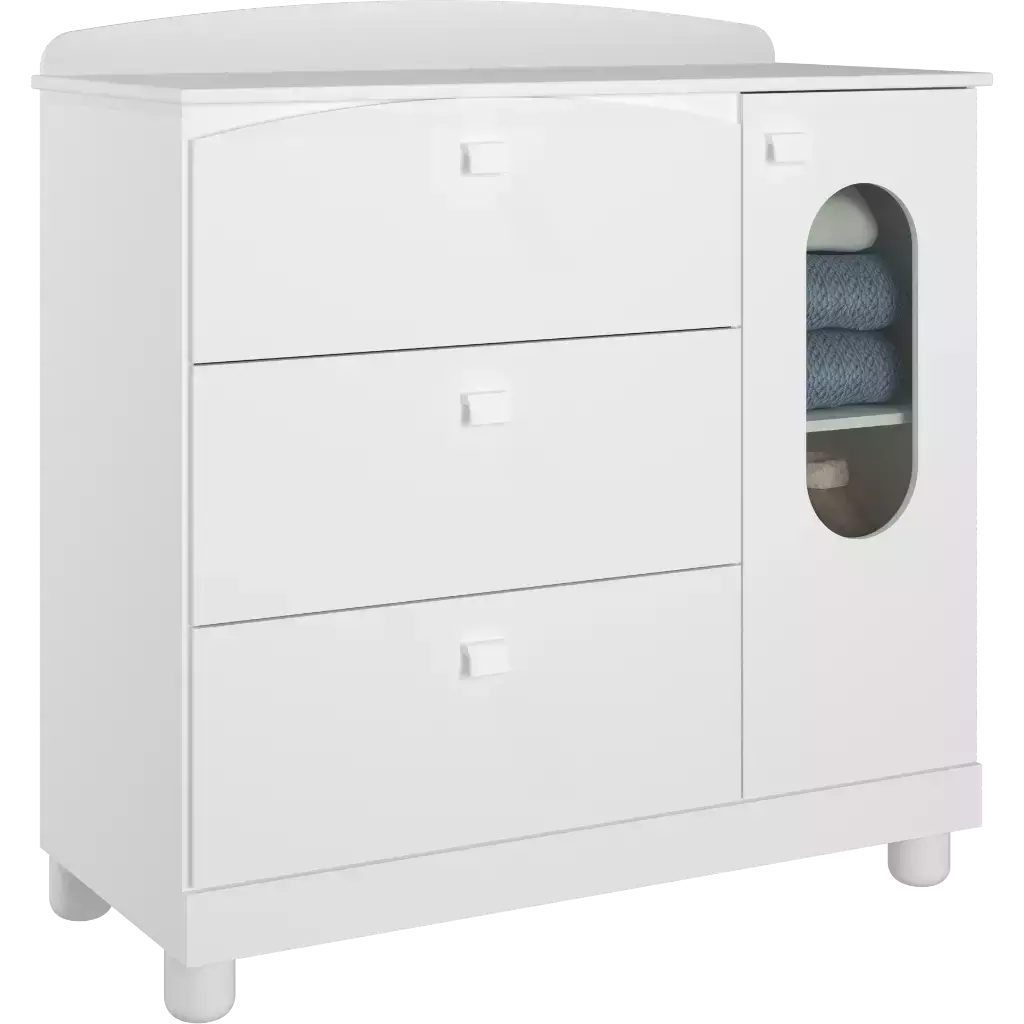 Suas formas curvas conferem ao móvel um toque decorativo no quarto dos pequenos. Possui 3 gavetas grandes com corrediças metálicas e fundo encaixado que proporciona maior resistência. Possui também 1 porta de abrir com prateleira interna e 1 cabideiro para você montar de acordo com sua necessidade. Seu tampo possui bordas arredondadas que recebem pintura em lacca com tinta atóxica e as peças retas recebem pintura UV também com tinta e verniz atóxicos. Fabricada com matéria-prima 100% MDF, um material ecologicamente correto e de ótima durabilidade e resistência. A porta possui detalhe vazado que recebe um material transparente que é PETG cristal, um termoplástico resistente a impactos e de excelente acabamento.