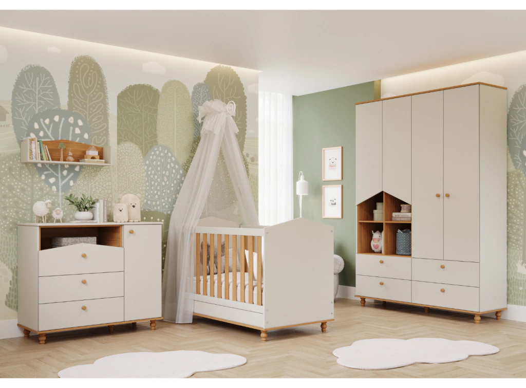 Seguindo o estilo lúdico, esse roupeiro é perfeito para quem deseja um móvel para organizar e, também, decorar. O detalhe fica por conta dos nichos laterais e as portas em formato casinha. Os puxadores e pés são torneados em madeira maciça e conferem um charme especial ao produto. Possui 4 gavetas grandes com corrediças telescópicas que proporcionam deslizamento suave, maior abertura e melhor acesso às roupas. Os nichos laterais podem ser utilizados para objetos decorativos, cestos para organização de brinquedos, livros e etc. Os espaços internos de prateleiras e maleiros são ideais para guardar desde objetos menores até objetos maiores como malas, pacotes de fraldas e caixas ou cestos de organização. Fabricado com matéria-prima 100% MDF, um material ecologicamente correto e de ótima durabilidade e resistência, esse roupeiro é excelente para quem precisa de bastante espaço para organizar tudo com muito carinho. O acabamento de pintura é feito com tinta e verniz UV atóxicos.